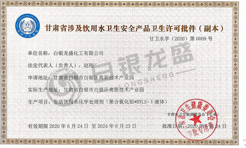 甘肅省涉及飲用水衛(wèi)生安全產(chǎn)品衛(wèi)生許可批件
